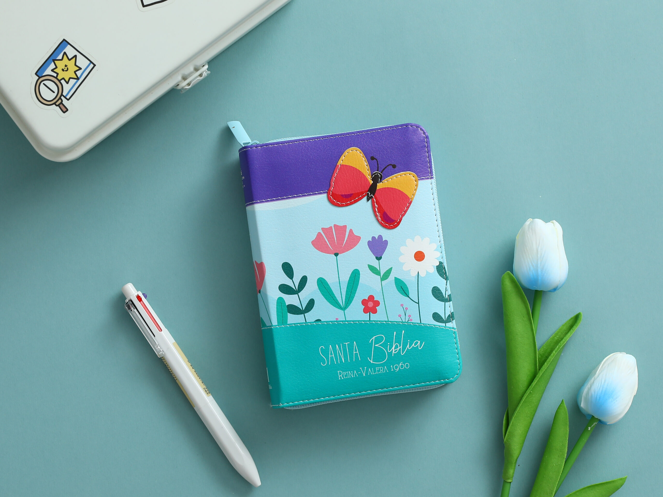 BIBLIA RVR60 025 CELESTE MARIPOSA CON CIERRE TAMAÑO BOLSILLO